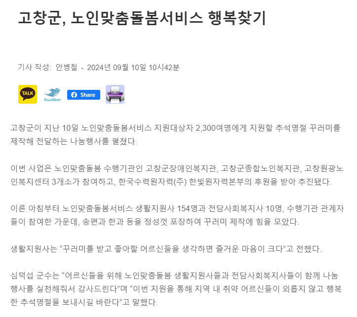 고창군, 노인돌봄맞춤서비스 행복찾기 [새전북신문] 문설 0 235 2024.09.11 10:41 http://sjbnews.com/news/news.php?number=827033 + 50 고창군, 노인돌봄맞춤서비스 행복찾기 [새전북신문]