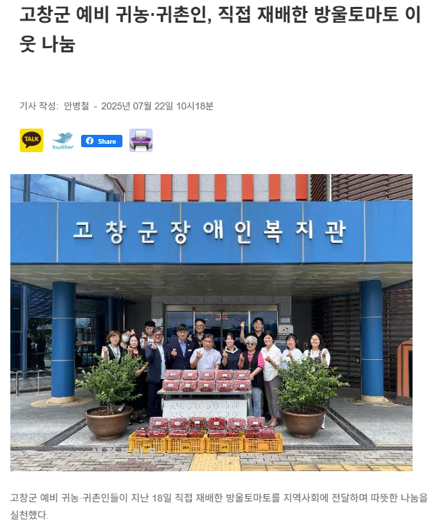 고창군 예비 귀농·귀촌인, 직접 재배 방울토마토 이웃 나눔[중도일보, 새전북신문] 문설 0 138 2025.07.23 12:25 https://www.joongdo.co.kr/web/view.php?key=20250723010007900 + 43 http://sjbnews.com/news/news.php?number=855656 + 47 고창군 예비 귀농·귀촌인, 직접 재배 방울토마토 이웃 나눔[중도일보, 새전북신문]