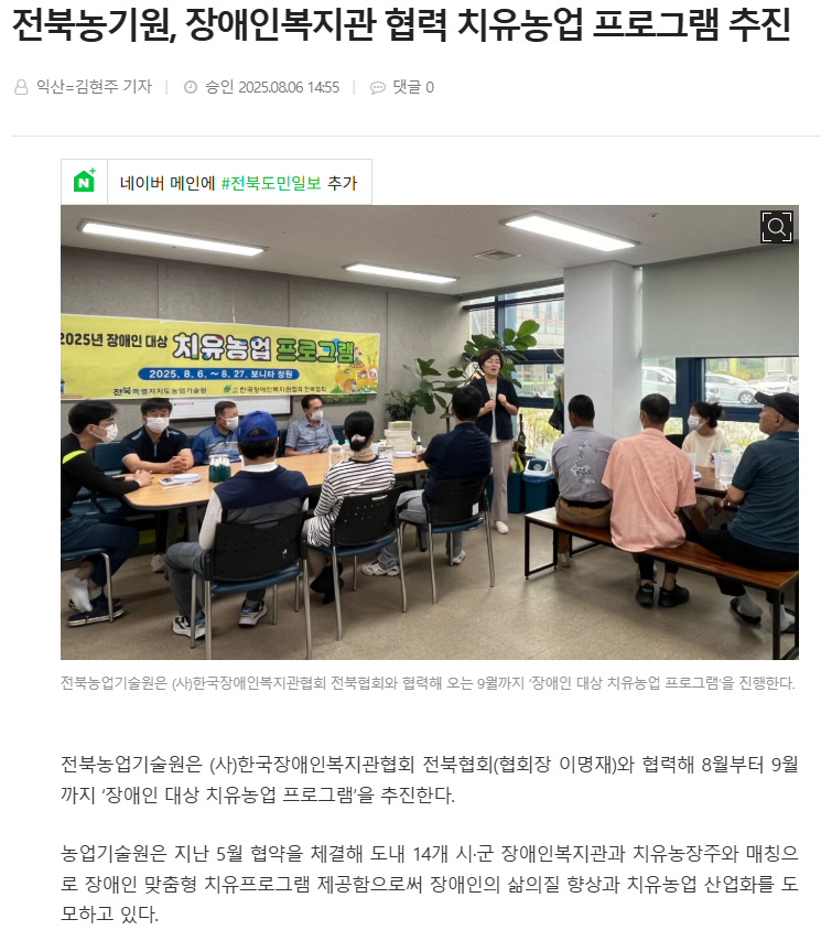 전북농기원, 장애인복지관 협력 치유농업 프로그램 추진[전북도민일보] 문설 0 147 2025.08.07 11:12 https://www.domin.co.kr/news/articleView.html?idxno=1524619 + 44 전북농기원, 장애인복지관 협력 치유농업 프로그램 추진[전북도민일보]