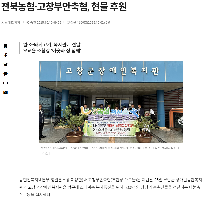 전북농협·고창부안축협, 현물 후원[축산경제신문,농수축산신문, 전북도민일보] 문설 0 138 2025.10.10 13:43 https://www.chukkyung.co.kr/news/articleView.html?idxno=77979 + 47 https://www.aflnews.co.kr/news/articleView.html?idxno=305785 + 43 전북농협·고창부안축협, 현물 후원[축산경제신문,농수축산신문, 전북도민일보]