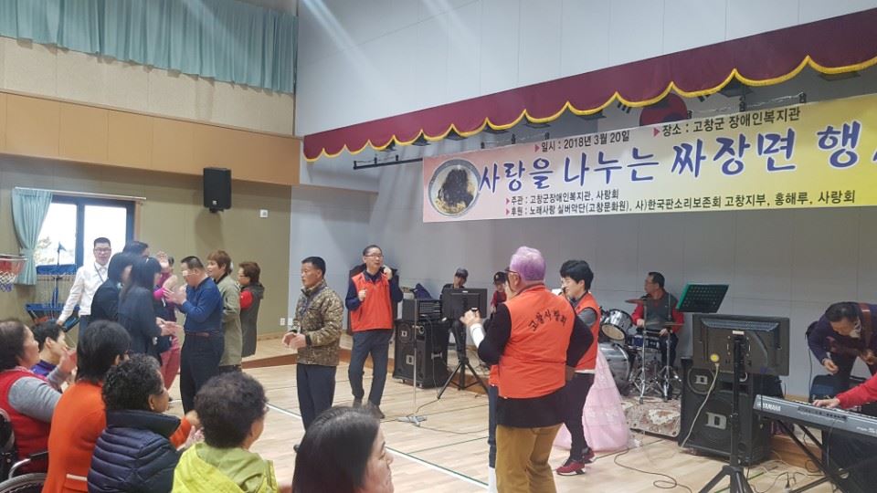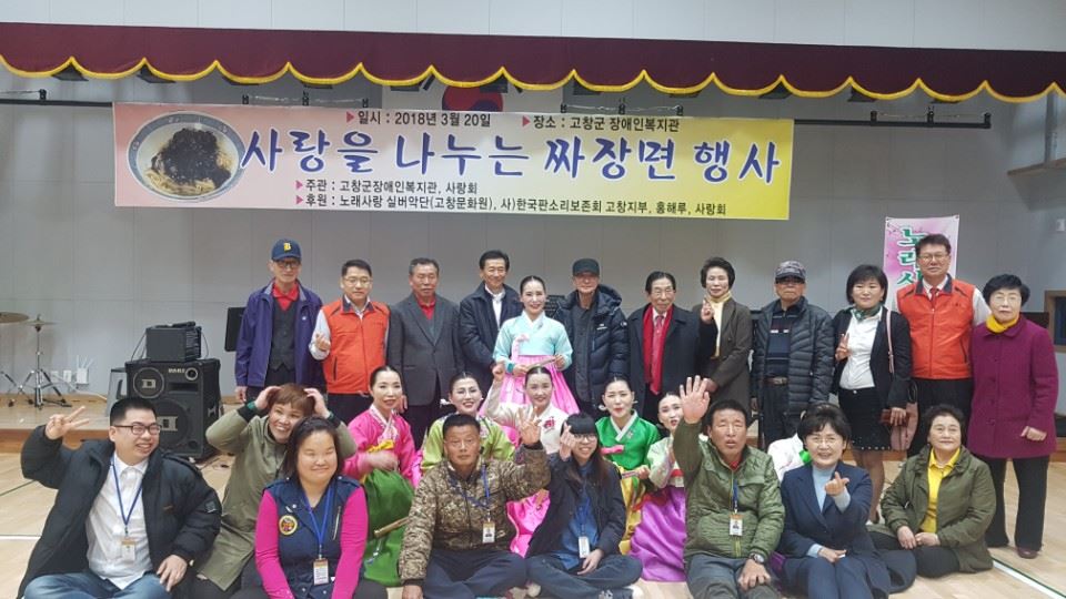고창군'사랑회' 자장면 봉사 최고관리자 0 1253 2018.03.26 13:50 고창군 '사랑회'는 지난 20일(화) 고창군장애인복지관(관장 정종만)을 방문하여 자장면 배식봉사를 진행하였습니다. 식전 진행 된 노래교실은 복지관 이용인들과 사랑회원들의 만남의 장이 되었습니다.