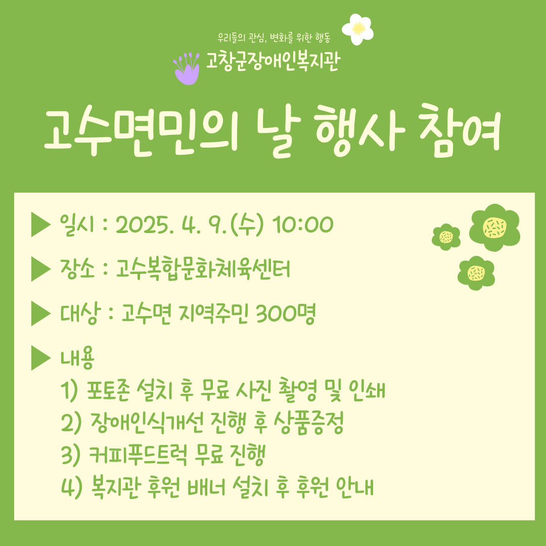 고수면민의 날 행사 참여 문설 0 212 2025.04.09 15:33 ▶ 일시 : 2025. 4. 9.(수) 10:00 ▶ 장소 : 고수복합문화체육센터 ▶ 대상 : 고수면 지역주민 300명 ▶ 내용 1) 포토존 설치 후 무료 사진 촬영 및 인쇄 2) 장애인식개선 진행 후 상품증정 3) 커피푸드트럭 무료 진행 4) 복지관 후원 배너 설치 후 후원 안내