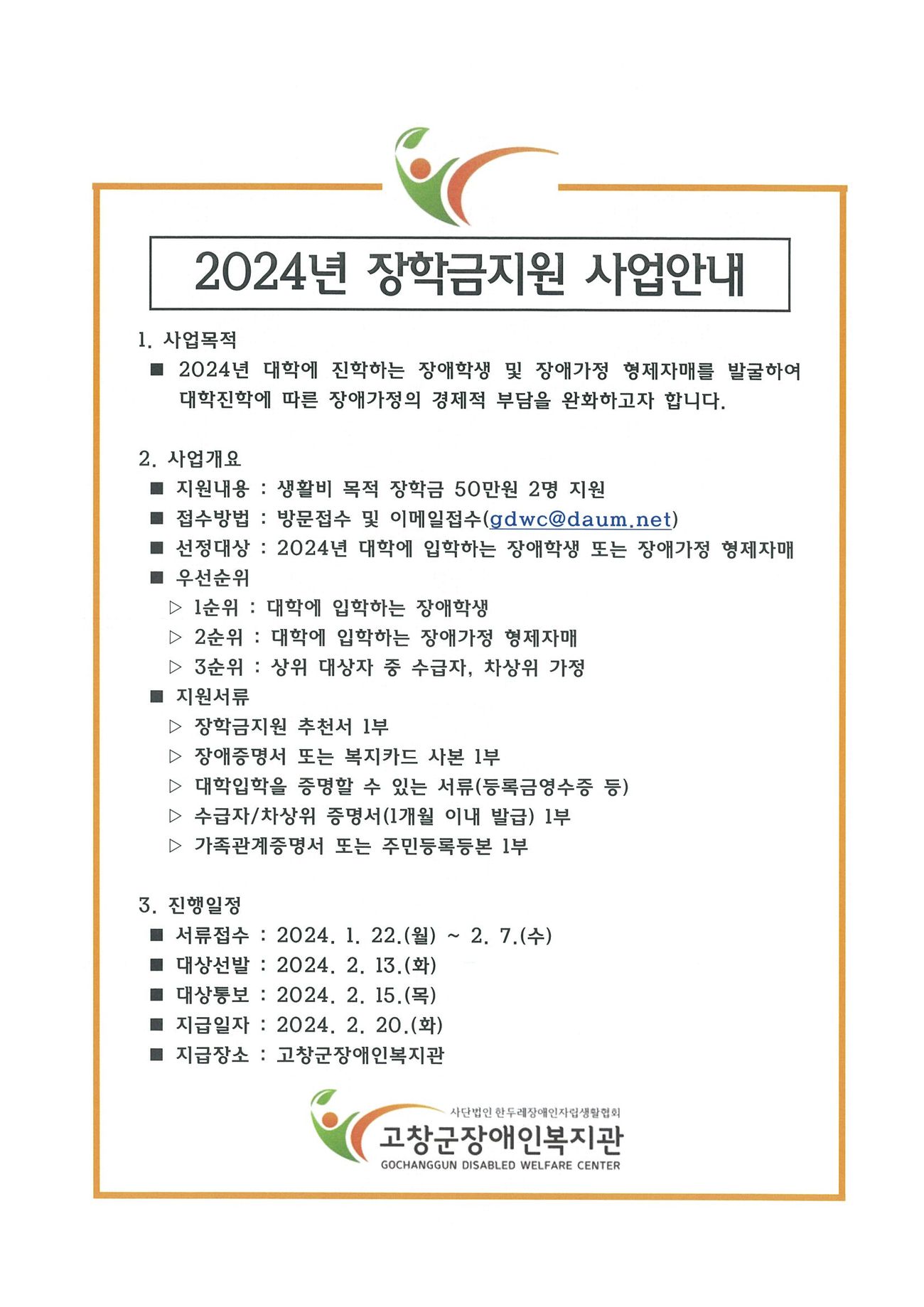 2024년 고창군장애인복지관 장학금지원 사업 안내 강지희 공지 0 360 2024.01.08 12:26 [붙임2][양식] 2024년 장학금지원 추천서.hwp (135.0K) + 10