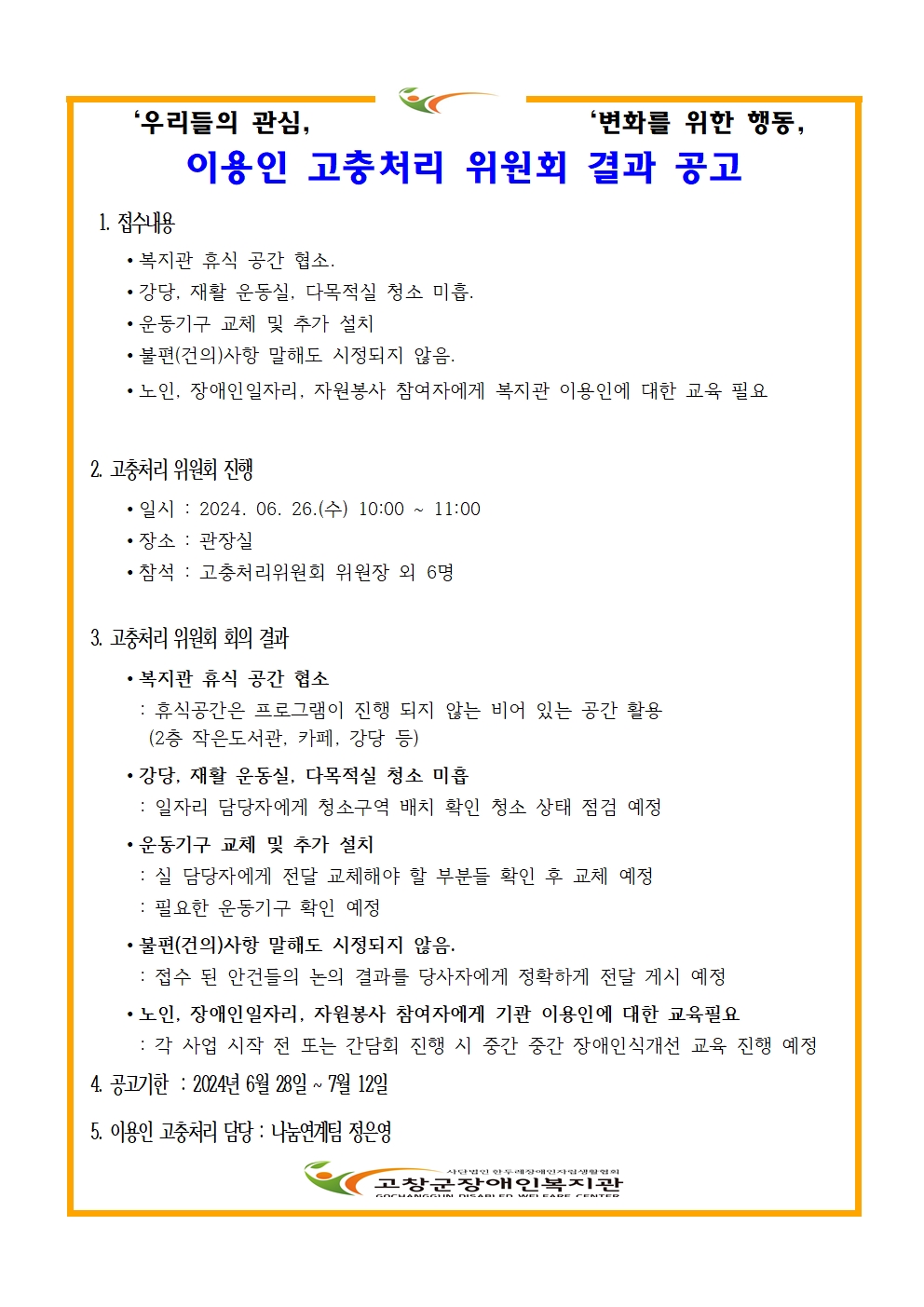 2024년 1차 이용인 고충처리 결과보고 별빛하늘 공지 0 245 2024.07.09 11:12 2024년 1차 이용인 고충처리 결과공고▶ 접수일자 : 2024.06.19.(수)▶ 접수경로 : 권익옹호 간담회▶ 회의진행 : 2024.06.26.(수) 10:00~11:00▶ 진행내용 : 이용인 고충처리 접수 안건 심의 2024년 1차 이용인 고충처리 위원회의 결과를 다음과 같이 공지합니다.더 발전하는 복지관을 만들기 위해 항상 최선을 다하겠습니다. 감사합니다.