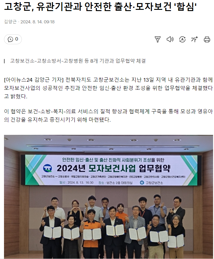 고창군, 관내 유관 기관과 모자보건 증진 위한 업무협약 [뉴스1, 아이뉴스24] 문설 0 169 2024.08.14 11:27 https://v.daum.net/v/20240814101029531 + 18 https://v.daum.net/v/20240814091853602 + 15 고창군, 관내 유관 기관과 모자보건 증진 위한 업무협약 [뉴스1, 아이뉴스24]