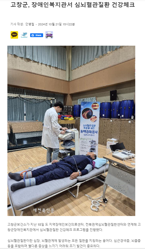 고창군, 장애인복지관서 심뇌혈관질환 건강체크 [새전북신문, 뉴시스] 문설 0 208 2024.10.25 14:55 http://sjbnews.com/news/news.php?number=830383 + 12 https://www.newsis.com/view/NISX20241021_0002928331 + 13 고창군, 장애인복지관서 심뇌혈관질환 건강체크 [새전북신문, 뉴시스]
