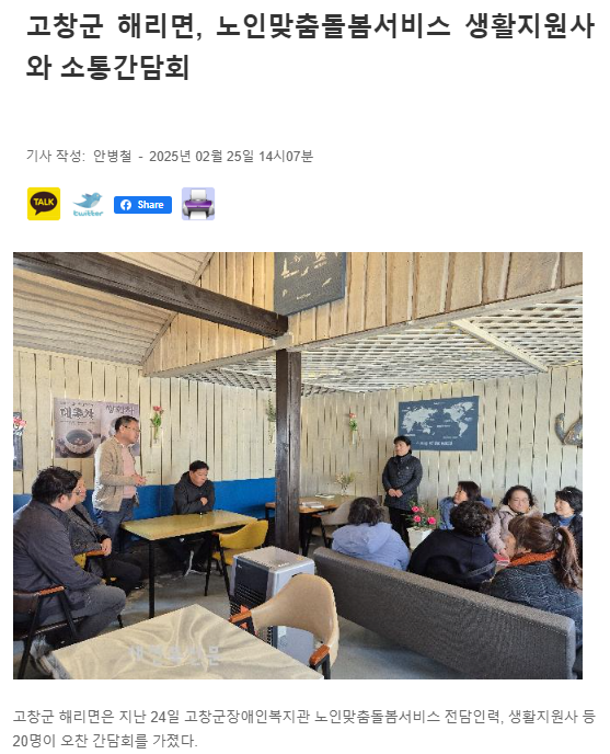 고창군 해리면, 노인맞춤돌봄서비스 생활지원사와 소통간담회[새전북신문, 전북일보] 문설 0 255 2025.02.27 11:44 http://sjbnews.com/news/news.php?number=842266 + 15 https://www.jeollailbo.com/news/articleView.html?idxno=760168 + 12 고창군 해리면, 노인맞춤돌봄서비스 생활지원사와 소통간담회[새전북신문, 전북일보]