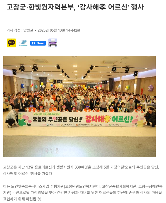 고창군·한빛원자력본부, ‘감사해孝 어르신’ 행사 [새전북신문, 전라일보] 문설 0 154 2025.05.14 11:49 http://sjbnews.com/news/news.php?number=849800 + 14 https://www.jeollailbo.com/news/articleView.html?idxno=767121 + 14 고창군·한빛원자력본부, ‘감사해孝 어르신’ 행사 [새전북신문, 전라일보]