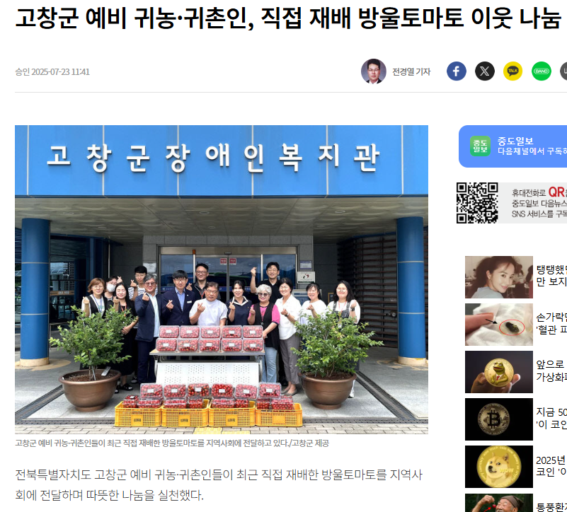 고창군 예비 귀농·귀촌인, 직접 재배 방울토마토 이웃 나눔[중도일보, 새전북신문] 문설 0 75 2025.07.23 12:25 https://www.joongdo.co.kr/web/view.php?key=20250723010007900 + 11 http://sjbnews.com/news/news.php?number=855656 + 15 고창군 예비 귀농·귀촌인, 직접 재배 방울토마토 이웃 나눔[중도일보, 새전북신문]