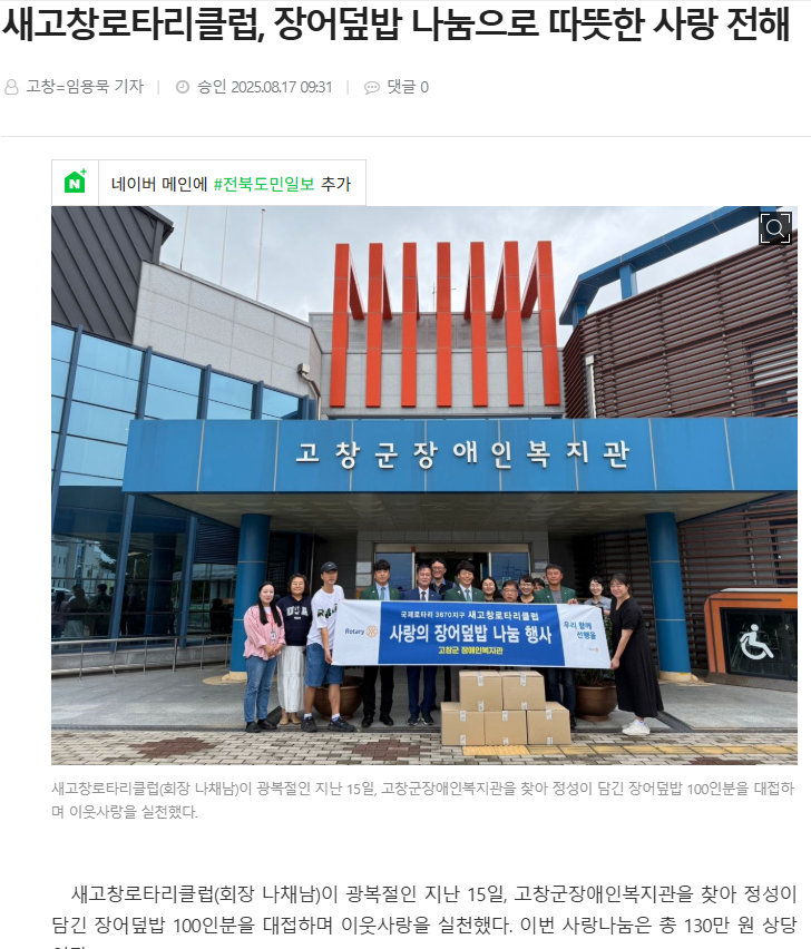 새고창로타리클럽, 장어덮밥 나눔으로 따뜻한 사랑 전해[전북도민일보] 문설 0 77 2025.08.19 16:53 https://www.domin.co.kr/news/articleView.html?idxno=1525597 + 11 새고창로타리클럽, 장어덮밥 나눔으로 따뜻한 사랑 전해[전북도민일보]