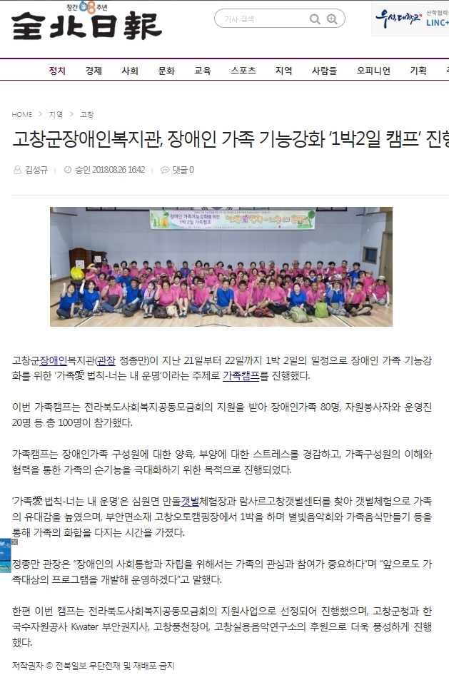 고창군장애인복지관, 장애인 가족기능강화 '1박2일 캠프' 진행[전북일보, 2018.08.26]