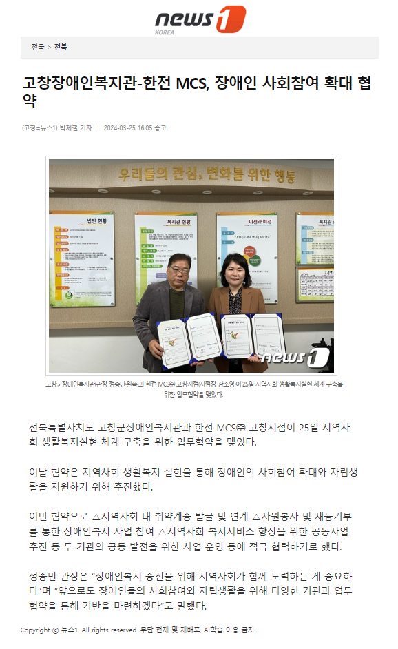 고창군장애인복지관-한전MCS 장애인 사회참여 확대 업무협약 [news1, 전북일보] 철웅복지사 1 348 2024.03.26 17:00 https://www.news1.kr/articles/5362088 + 15 https://www.jjan.kr/article/20240326580004 + 19 고창군장애인복지관-한전MCS 장애인 사회참여 확대 업무협약 [news1, 전북일보]