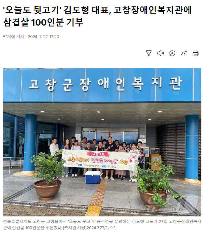 '오늘도 뒷고기' 김도형 대표, 고창장애인복지관에 삼겹살 100인분 기부 [전북 뉴스1] 문설 0 180 2024.08.06 08:39 https://v.daum.net/v/20240727172017877 + 10 '오늘도 뒷고기' 김도형 대표, 고창장애인복지관에 삼겹살 100인분 기부 [전북 뉴스1]