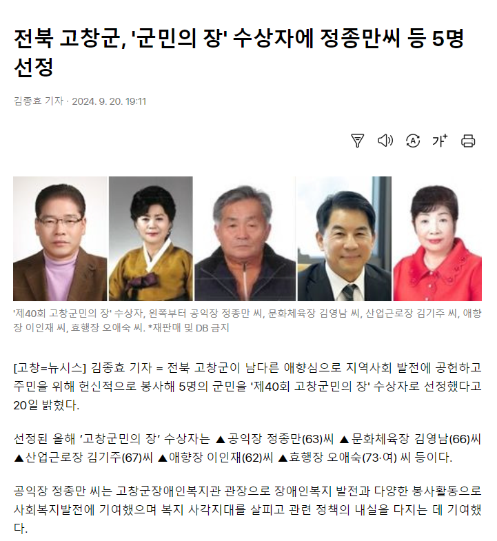 전북 고창군, '군민의 장' 수상자에 정종만씨 등 5명 선정 [뉴시스, 새전북신문] 문설 1 425 2024.09.24 10:19 http://www.sjbnews.com/news/news.php?code=li_news&number=827817 + 17 https://v.daum.net/v/20240920191108110 + 20 전북 고창군, '군민의 장' 수상자에 정종만씨 등 5명 선정 [뉴시스, 새전북신문]
