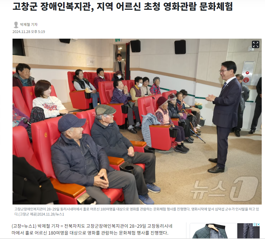 고창군 장애인복지관, 지역 어르신 초청 영화관람 문화체험[뉴스1, 새전북신문] 문설 0 213 2024.11.29 14:51 https://www.news1.kr/local/jeonbuk/5615016 + 10 http://sjbnews.com/news/news.php?number=834346 + 12 고창군 장애인복지관, 지역 어르신 초청 영화관람 문화체험[뉴스1, 새전북신문]