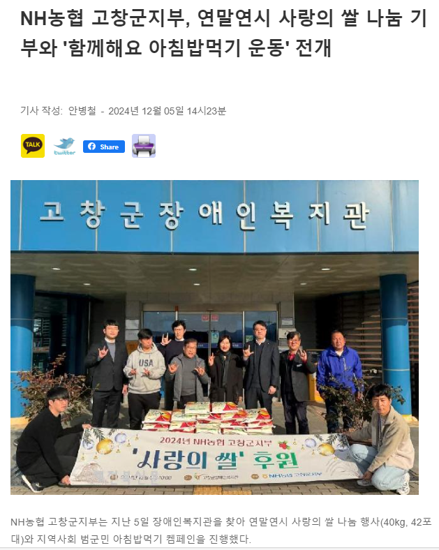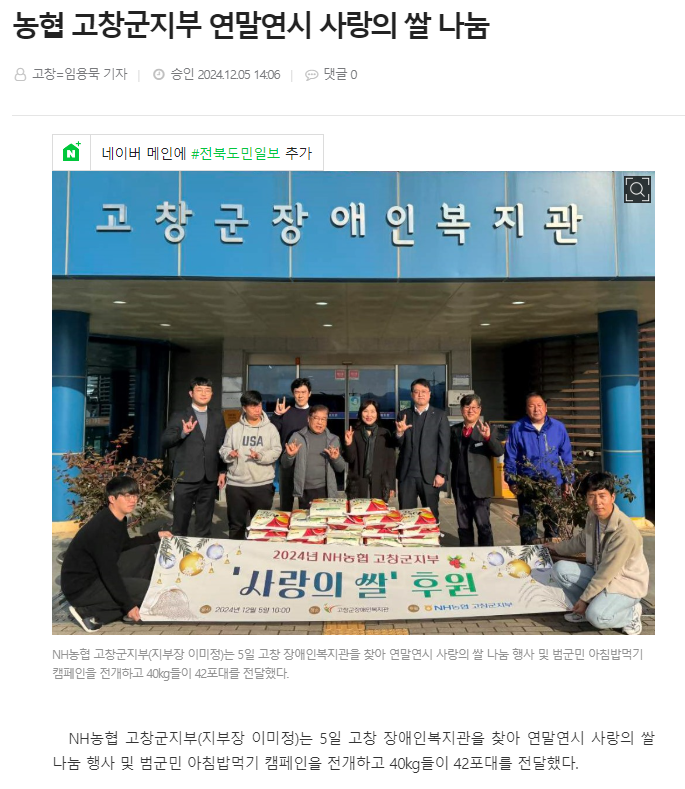 농협 고창군지부 연말연시 사랑의 쌀 나눔[전북도민일보, 새전북신문] 문설 0 115 2024.12.05 17:24 https://www.domin.co.kr/news/articleView.html?idxno=1494458 + 13 http://sjbnews.com/news/news.php?number=835082 + 16 농협 고창군지부 연말연시 사랑의 쌀 나눔[전북도민일보, 새전북신문]
