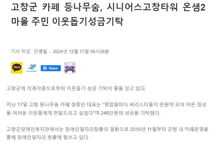 고창군 카페 등나무숨, 시니어스고창타워 온샘2마을 주민 이웃돕기성금기탁[새전북신문] 문설 0 155 2024.12.23 10:37 http://sjbnews.com/news/news.php?number=836178 + 13 고창군 카페 등나무숨, 시니어스고창타워 온샘2마을 주민 이웃돕기성금기탁[새전북신문]