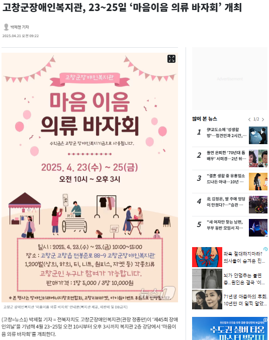 고창군장애인복지관, 23~25일 ‘마음이음 의류 바자회’ 개최[뉴스1, 새전북신문]