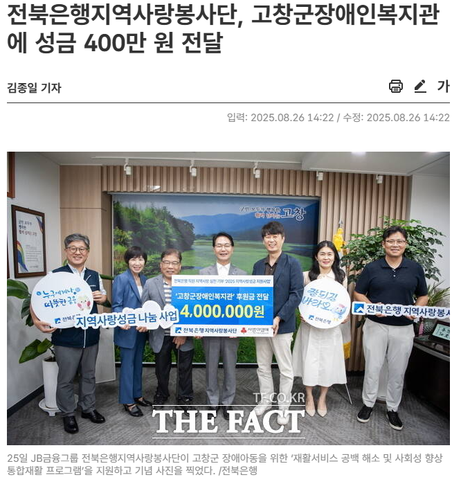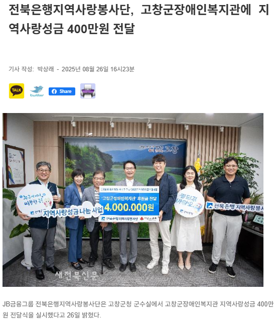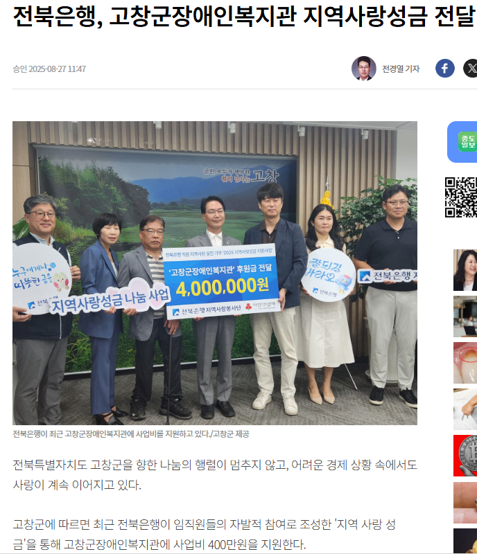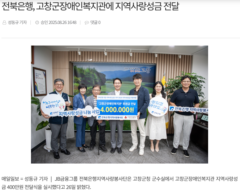 전북은행, 고창군장애인복지관 지역사랑성금 전달[중도일보, 전북도민일보, 더팩트, 매일일보, 새전북신문, 전민일보, 전라일보] 문설 0 72 2025.08.28 11:48 https://www.joongdo.co.kr/web/view.php?key=20250827010008598 + 13 https://www.domin.co.kr/news/articleView.html?idxno=1526743 + 16 전북은행, 고창군장애인복지관 지역사랑성금 전달[중도일보, 전북도민일보, 더팩트, 매일일보, 새전북신문, 전민일보, 전라일보]