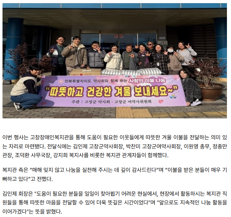 전주·남원·임실·고창약사회 "사랑의 이불로 따뜻한 겨울을"[데일리팜] 문설 0 26 01.06 10:05 https://www.dailypharm.com/user/news/333929?REFERER=NP + 12 전주·남원·임실·고창약사회 "사랑의 이불로 따뜻한 겨울을"[데일리팜]