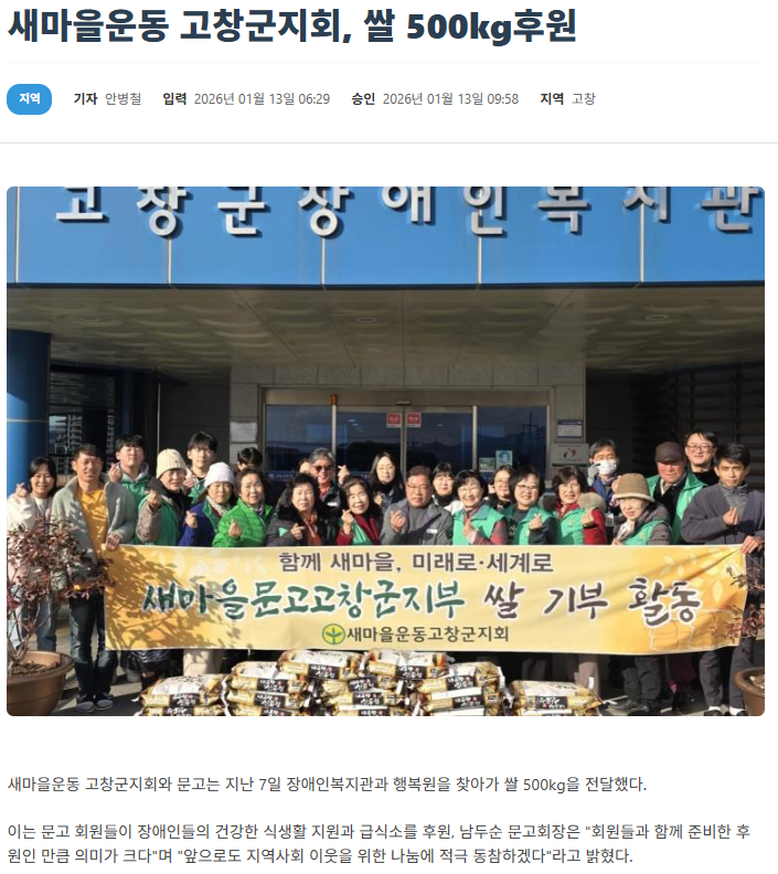 새마을운동 고창군지회, 쌀 500kg후원[세전북신문] 문설 0 19 01.15 11:10 https://sjbnews.com/news/news.php?number=869379 + 7 새마을운동 고창군지회, 쌀 500kg후원[세전북신문]
