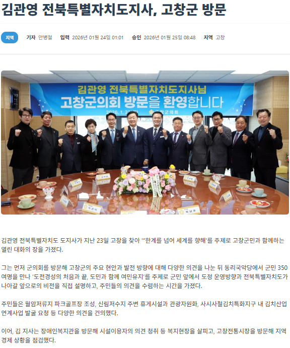 김관영 전북특별자치도지사, 고창군 방문[새전북신문 외 11곳] 문설 0 7 01.26 11:24 https://sjbnews.com/news/news.php?number=870176 + 1 https://www.breaknews.com/1179307 + 1 김관영 전북특별자치도지사, 고창군 방문[새전북신문 외 11곳]
