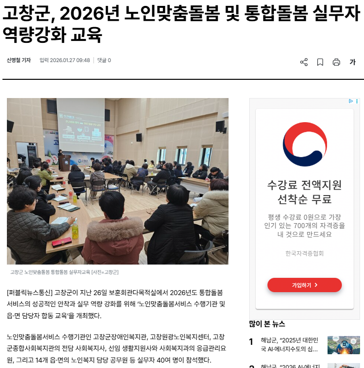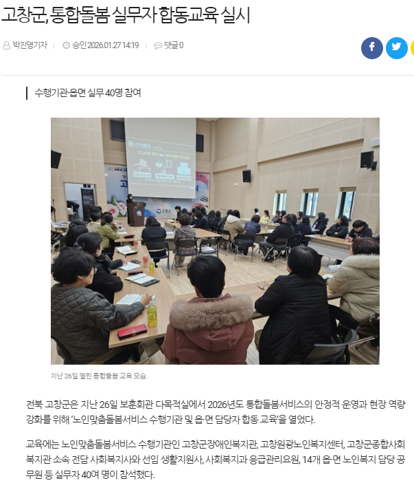고창군, 통합돌봄 실무자 합동교육 실시[중도일보, 새전북신문, 매일신문, 아시아경제, 퍼블릭뉴스통신] 문설 0 5 01.28 12:04 https://www.jeonmae.co.kr/news/articleView.html?idxno=1225376 + 1 https://sjbnews.com/news/news.php?number=870373 + 1 고창군, 통합돌봄 실무자 합동교육 실시[중도일보, 새전북신문, 매일신문, 아시아경제, 퍼블릭뉴스통신]