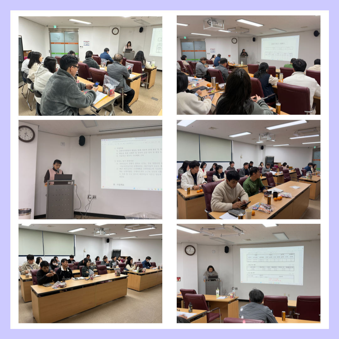 2024년 사업평가 및 2025년 세부운영사업계획 발표 문설 1 212 2024.12.23 13:20 2024년 사업평가 및 2025년 세부운영사업계획 발표○ 기간 : 2024. 12. 16.(월) ~ 18.(수)○ 장소 : 1층 소회의실○ 대상 : 전직원(24명)○ 내용 ① 2024년 전체 사업평가 진행 후, 피드백을 통한 2025년 사업 진행방안 모색 및 세부운영사업계획 수립 ② 발표를 통한 전 직원 사업 운영 방안 공유및 복지관 사업 이해