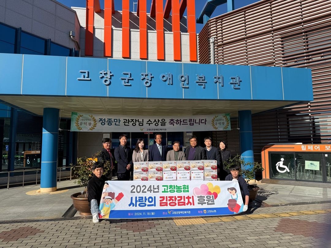 [후원] 고창농협 - 김장김치 강지희 3 351 2024.11.21 12:06 사랑의 나눔 소식 2024년 11월 18일 고창농협에서 따뜻한 마음을 담아 김장김치 30박스를 후원해 주셨습니다.이번 후원은 지역 내 장애인분들게 건강한 겨울을 선물하며 따뜻한 나눔의 의미를 더했습니다.고창농협의 사랑과 관심 덕분에 지역사회의 온기가 가득해지고 있습니다.다시 한번 진심으로 감사드리며, 여러분의 나눔이 소중한 희망으로 전해질 수 있도록고창군장앵니복지관도 더욱 노력하겠습니다.사랑과 나눔이 함께하는 지역사회, 우리 모두가 만들어갑니다.김장김치 후원문의 : 063-562-3777