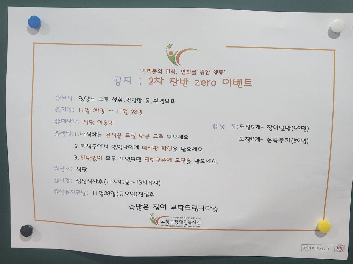 2025년 2차 잔반이벤트 심선옥 0 81 2025.12.09 14:01 - 일시 : 11. 28.(금) 11:30 ~ 12:30- 장소 : 식당- 대상 : 복지관 이용인- 내용 : 잔반쿠폰을 다 채울시 (쿠폰5개-장어덮밥, 쿠폰4개-쪽득쿠키)제공